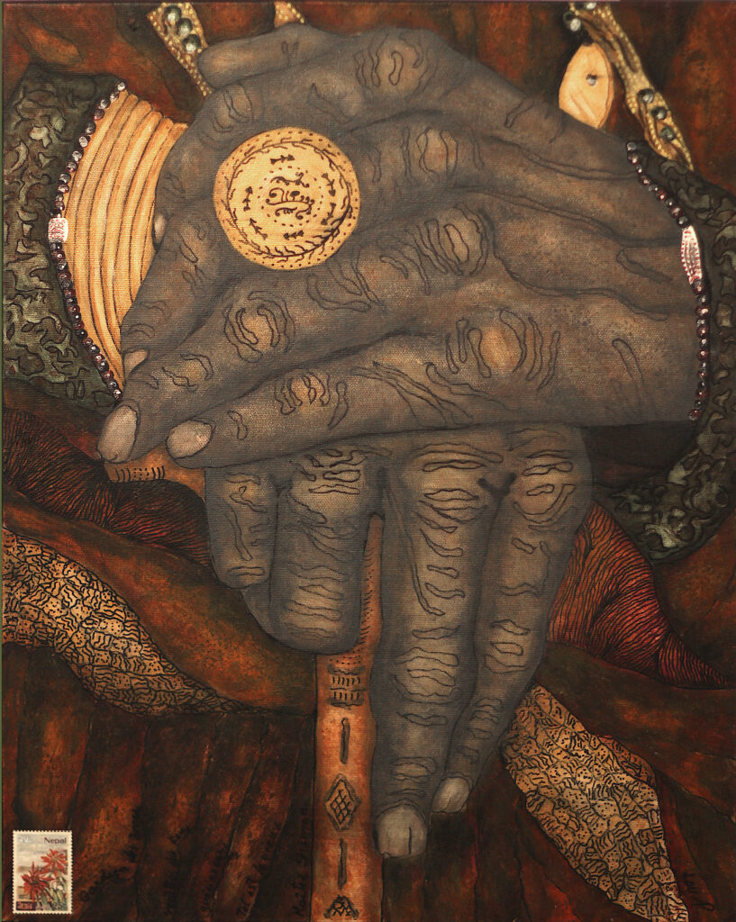 Le vieux Maître Shaman – 2020/ Série « Cartes postales de mes transhumances » Acrylique sur toile – (18×14 pouces)