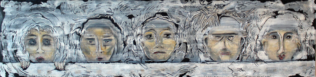 Les gardiens de mon sommeil – 2019/ Série « Cartes postales de mes transhumances » Technique mixte sur toile (15×60 pouces)