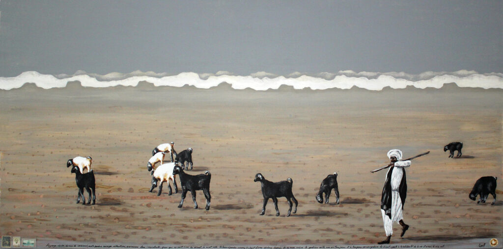 – NON DISPONIBLE – Mirage – 2018/ Série « Cartes postales de mes transhumances » Acrylique sur toile – (36×72 pouces) – Paysage rêche, dunes de caramel, vents perdus, mirage, réfraction, promesse de l’eau inexistante, pour qui ne sait lire le désert la mort rode. Silence éperdu comme le chant d’une sirène égarée loin de sa mer mère. Le gardien veille sur son troupeau et le troupeau sur son gardien. Le désert appelle à la solidarité de la vie et ainsi la vie vit.